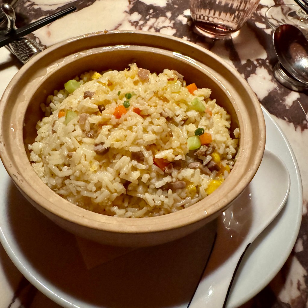An unexpected serving of mundane egg fried rice followed. It was served entirely on its own (what the duck!) and was lacking in any distinct flavour. We both exchanged raised eyebrows – knowing that anything we said would be overheard by the staff behind the curtain of our booth. I took two bites and politely agreed to take it to go (and to be fair I managed to improve it the next day in a hot wok with the addition of some chicken thighs, prawns, soy sauce, oyster sauce, sesame oil, coriander and fresh chillies).
